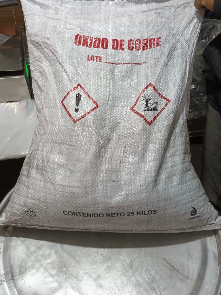 Presentacion de oxido de cobre negro. Sacos de rafia, dentro contienen proteccion de platico. Sacos de 25 kg